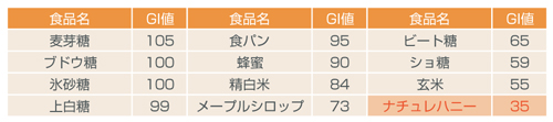 血糖値の上昇が緩やかで体への負担が少ない「ナチュレハニー」なら血糖値の気になる方やダイエットにもお勧めです。GI値とは摂取後の血糖値の上昇スピードを表す値で、GI値が少ないほど糖質の吸収がゆっくりで食後の血糖値上昇も緩やかで、糖質と脂肪を効率よく燃焼させます。そのため腹持ちが良く、空腹感も抑えてくれます。