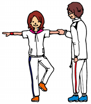 イラストの様に両腕を広げて片足立ちをした人の腕の肘の部分を真下に押して下さい。その時に、押された人は腕が下がらないよう耐えて下さい。その場合、簡単に横に倒れてしまうでしょう。