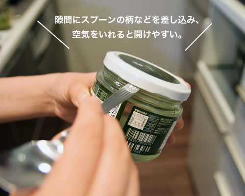 瓶を逆さにしてフタの部分を湯煎などで温めると簡単にフタを開けることができます。