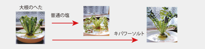 普通の塩は、「青菜に塩」という諺のように萎えて腐敗。還元力を持った焼塩「キパワーソルト」を溶かした水に浸した方は、鮮度を取り戻して元気に。このように「キパワーソルト」は、酸化したサビを取る還元力と、生命維持に必要なマグネシウム・カリウム・カルシウムなどの成分を供給して元気を取り戻す作用があります。