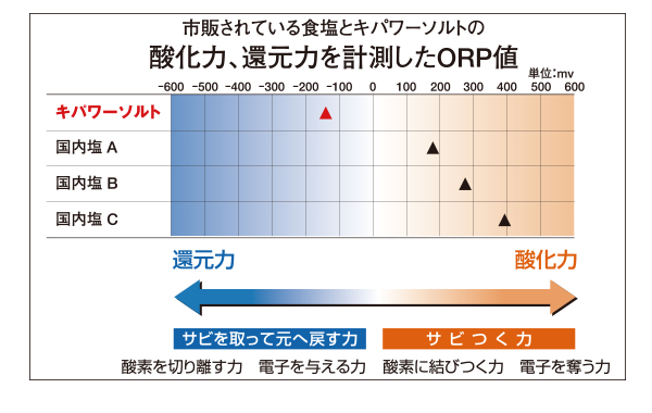 「キパワーソルト」は、海水に含まれた自然のままの成分とバランスを保ち、物質の酸化(サビ)を取って元に戻すチカラ、還元力を持っています。